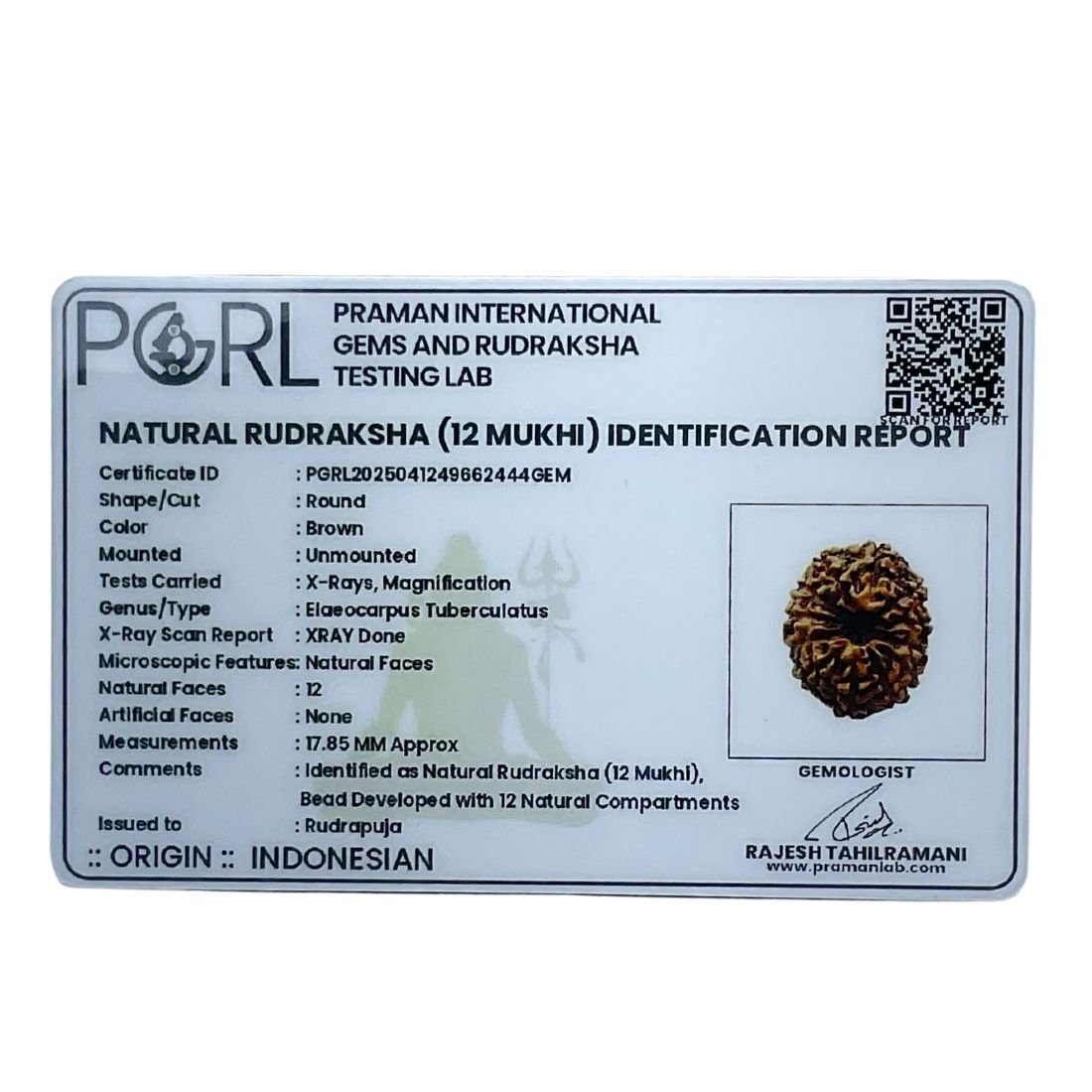Shrimad Devibhagwat mention than 12 Mukhi rudraksha dispels fear of armed men, horned animals, and lion. The wearer never suffers from physical and mental pain and makes the Person fearless and trouble-free. Rudrakshajabalopanishad mentions Lord Vishnu blessing this bead.