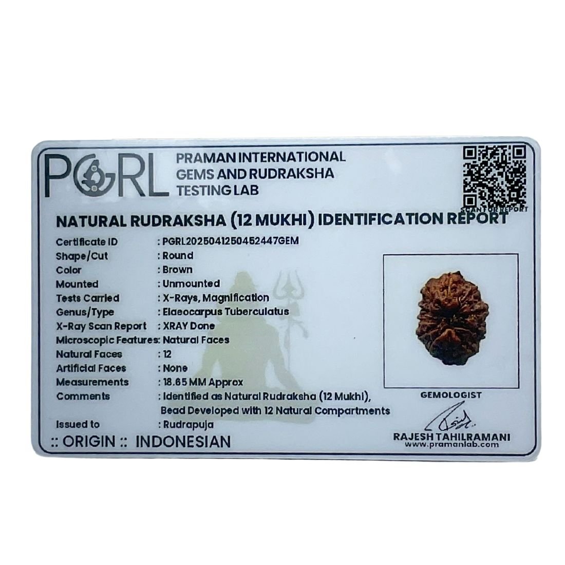 Shrimad Devibhagwat mention than 12 Mukhi rudraksha dispels fear of armed men, horned animals, and lion. The wearer never suffers from physical and mental pain and makes the Person fearless and trouble-free. Rudrakshajabalopanishad mentions Lord Vishnu blessing this bead.