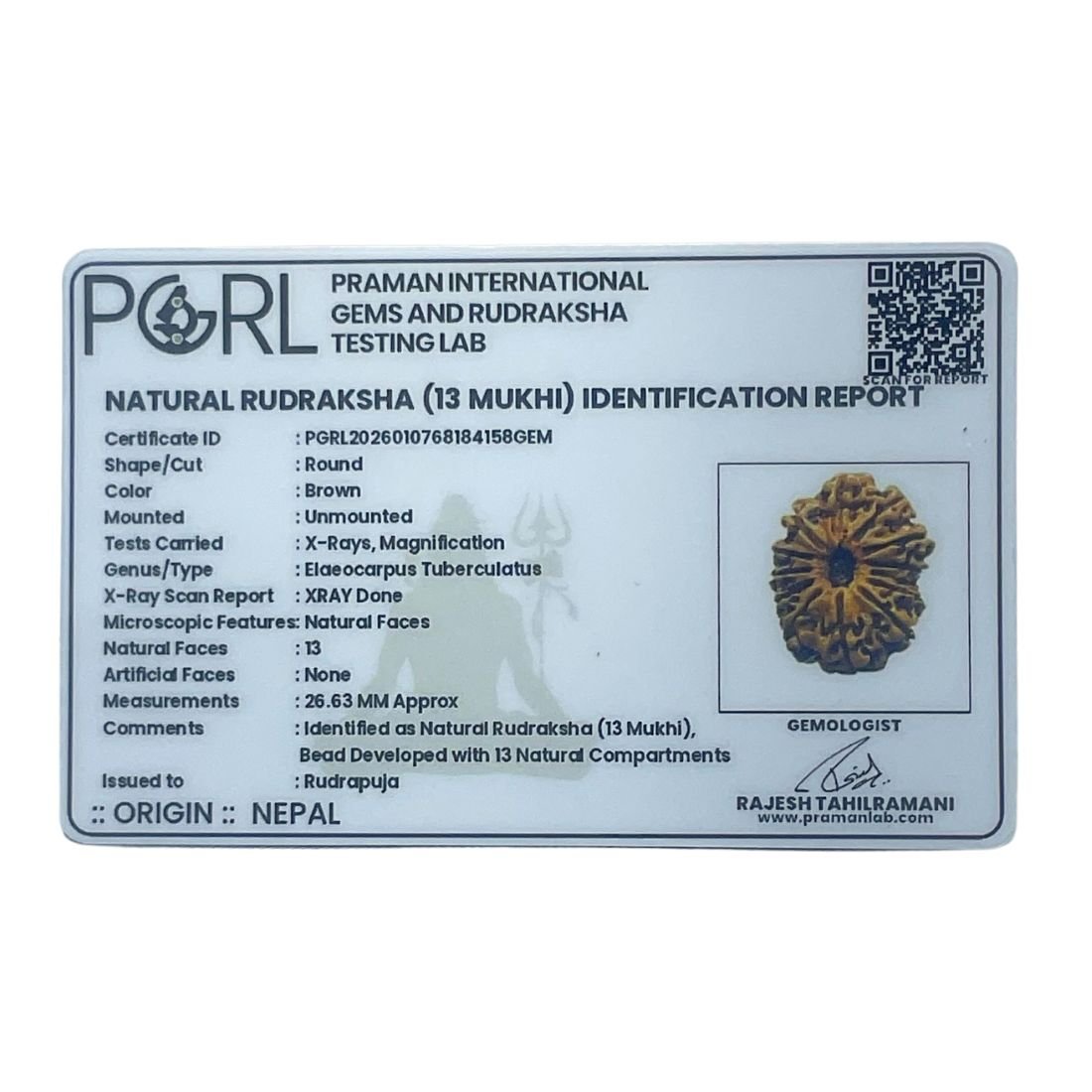 According to Shiva Purana, a rudraksha with thirteen faces is Visvedeva. By wearing it, a man will attain the realization of all desires. He will derive good fortune and auspiciousness.