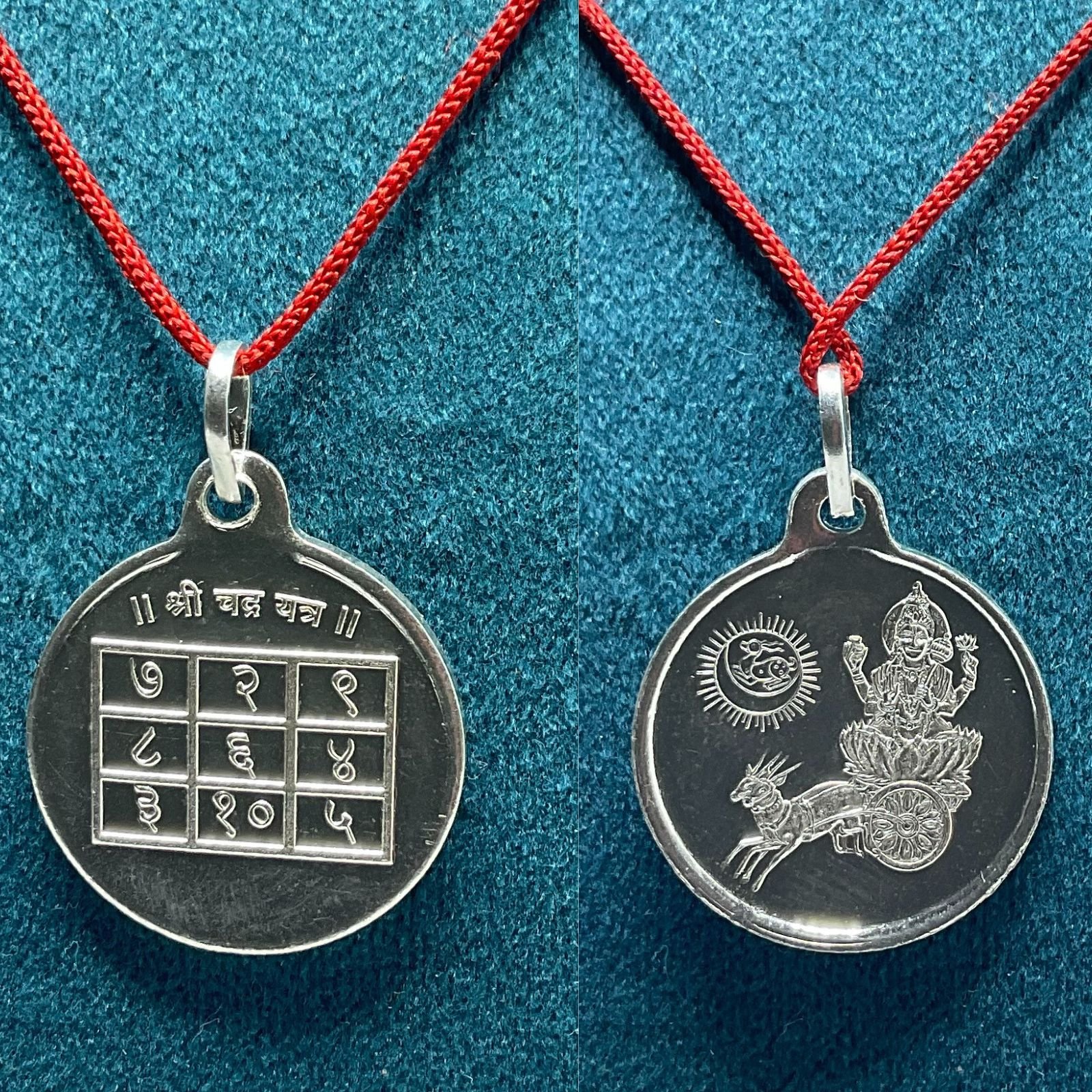 Chandra Yantra locket in Silver, known as the visual tool for Lord Chandra(Moon), is the second in the Navagraha, the Nine Planets of Hindu astrology. He rules the zodiac sign Cancer, 4th spot in the natal chart—an incarnation of Goddess Parvati, the controlling deity of Chandra. Chandra navigates for two and a half days in every zodiac sign and 28 days to turn around all twelve zodiac signs.