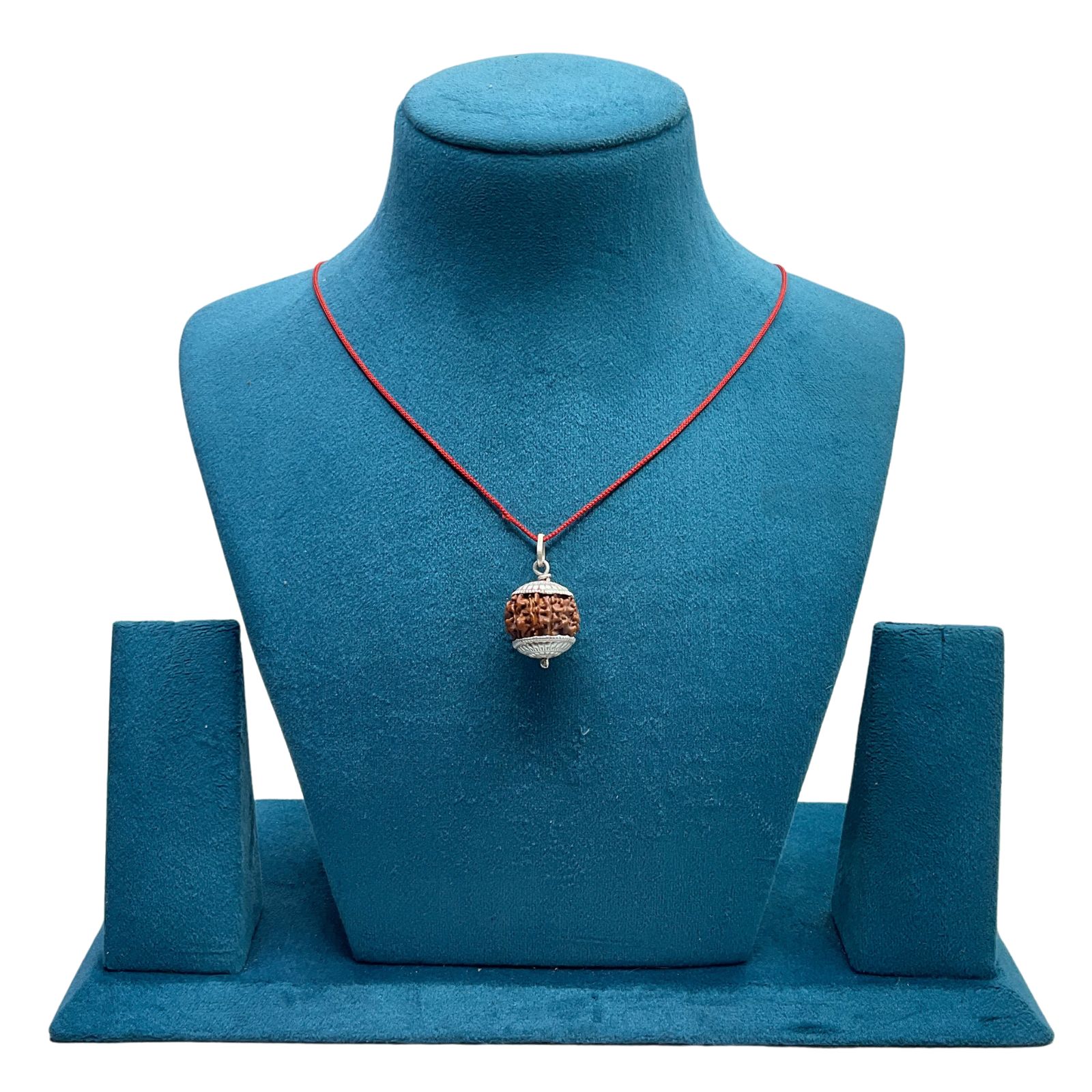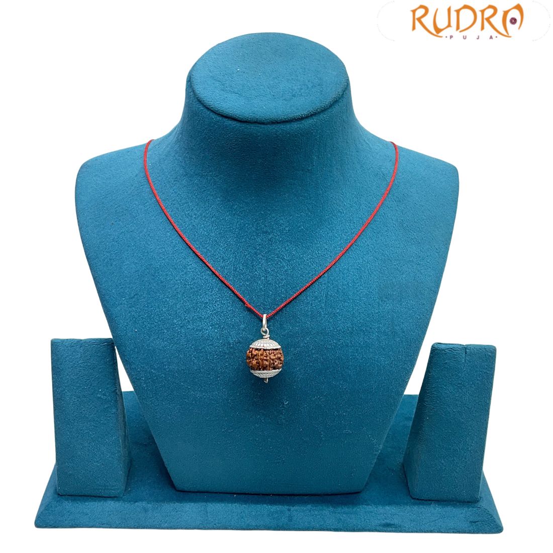 Encased in an elegant silver capping, this Rudraksha bead is not only spiritually significant but also aesthetically appealing. The silver cap adds a layer of protection to the sacred bead and enhances its divine energy. Many believe that silver itself has purifying qualities, and when combined with the Rudraksha, it amplifies its effects. This design also makes it convenient to wear as a pendant or as part of a mala (rosary), keeping the divine energy close to the heart or throat chakra depending on how it is worn.
