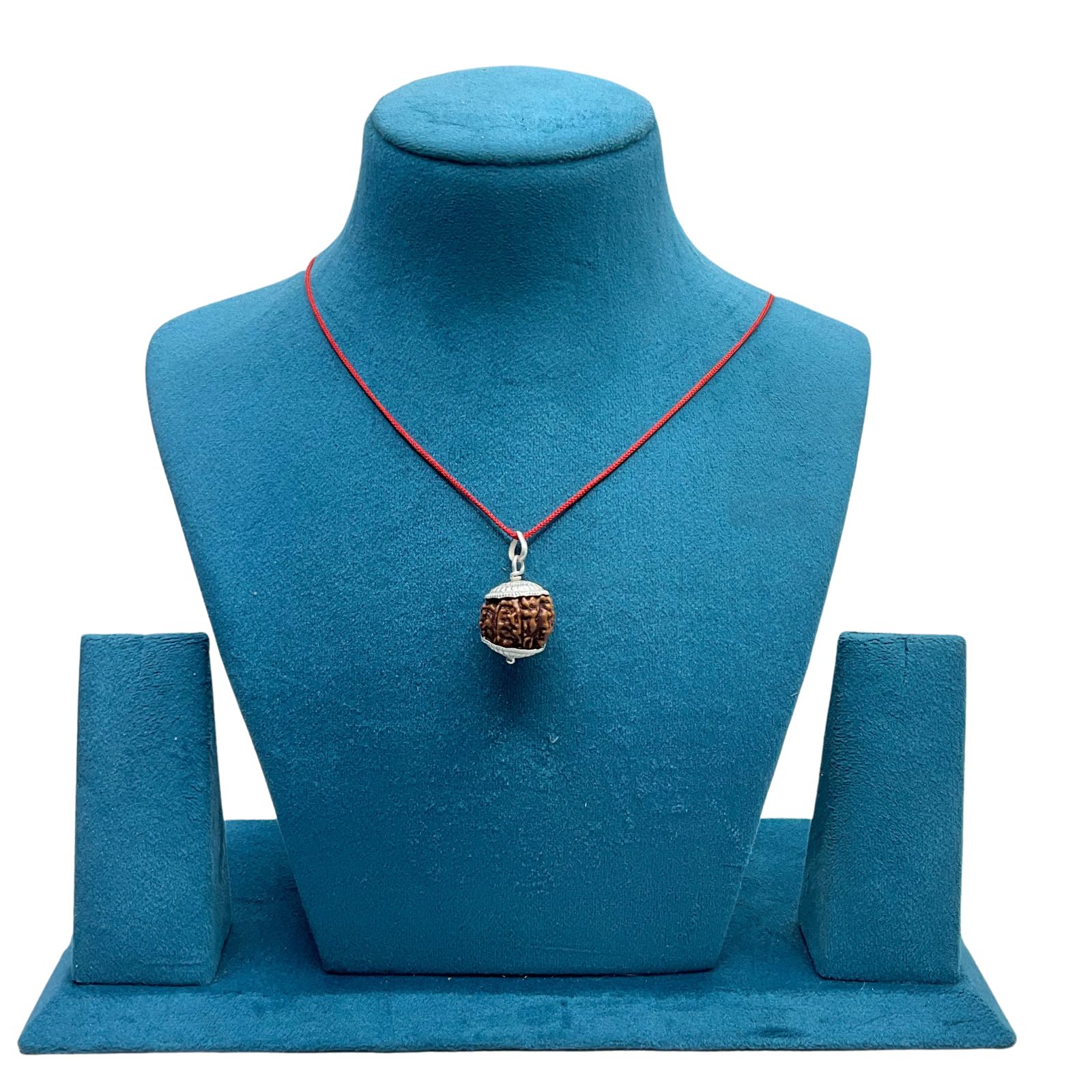 Encased in an elegant silver capping, this Rudraksha bead is not only spiritually significant but also aesthetically appealing. The silver cap adds a layer of protection to the sacred bead and enhances its divine energy. Many believe that silver itself has purifying qualities, and when combined with the Rudraksha, it amplifies its effects. This design also makes it convenient to wear as a pendant or as part of a mala (rosary), keeping the divine energy close to the heart or throat chakra depending on how it is worn.