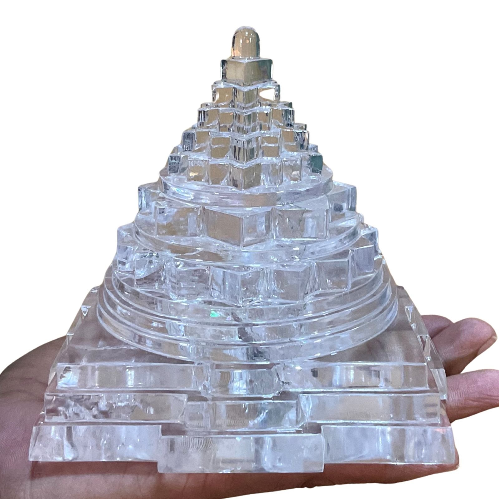 Original Crystal Shree Yantra is made of clear quartz crystal, which is known for its high vibrational properties and ability to amplify energy. It is usually a three-dimensional geometric figure consisting of nine interlocking triangles, with a central point known as the Bindu, surrounded by concentric circles and lotus petals.
