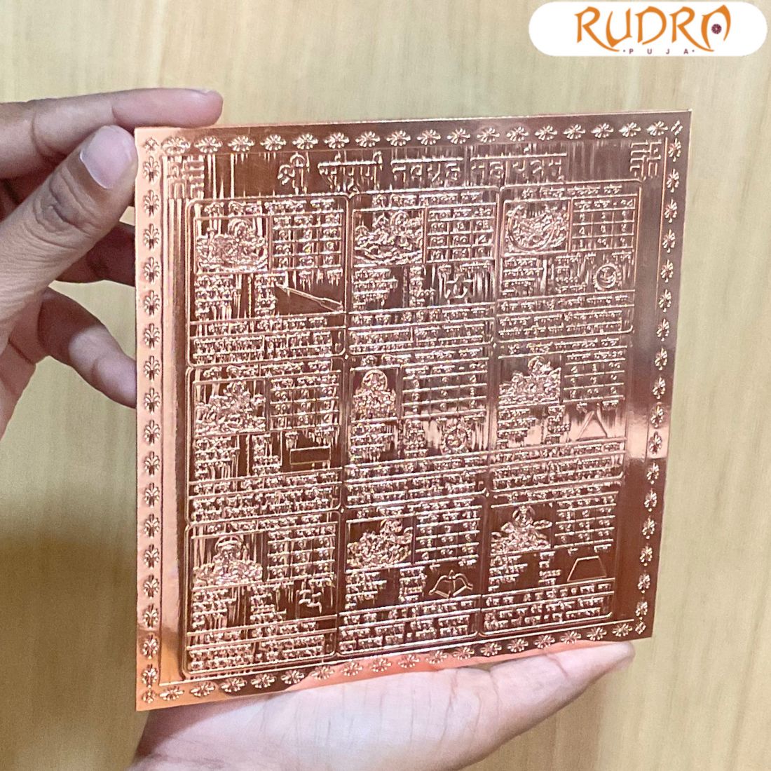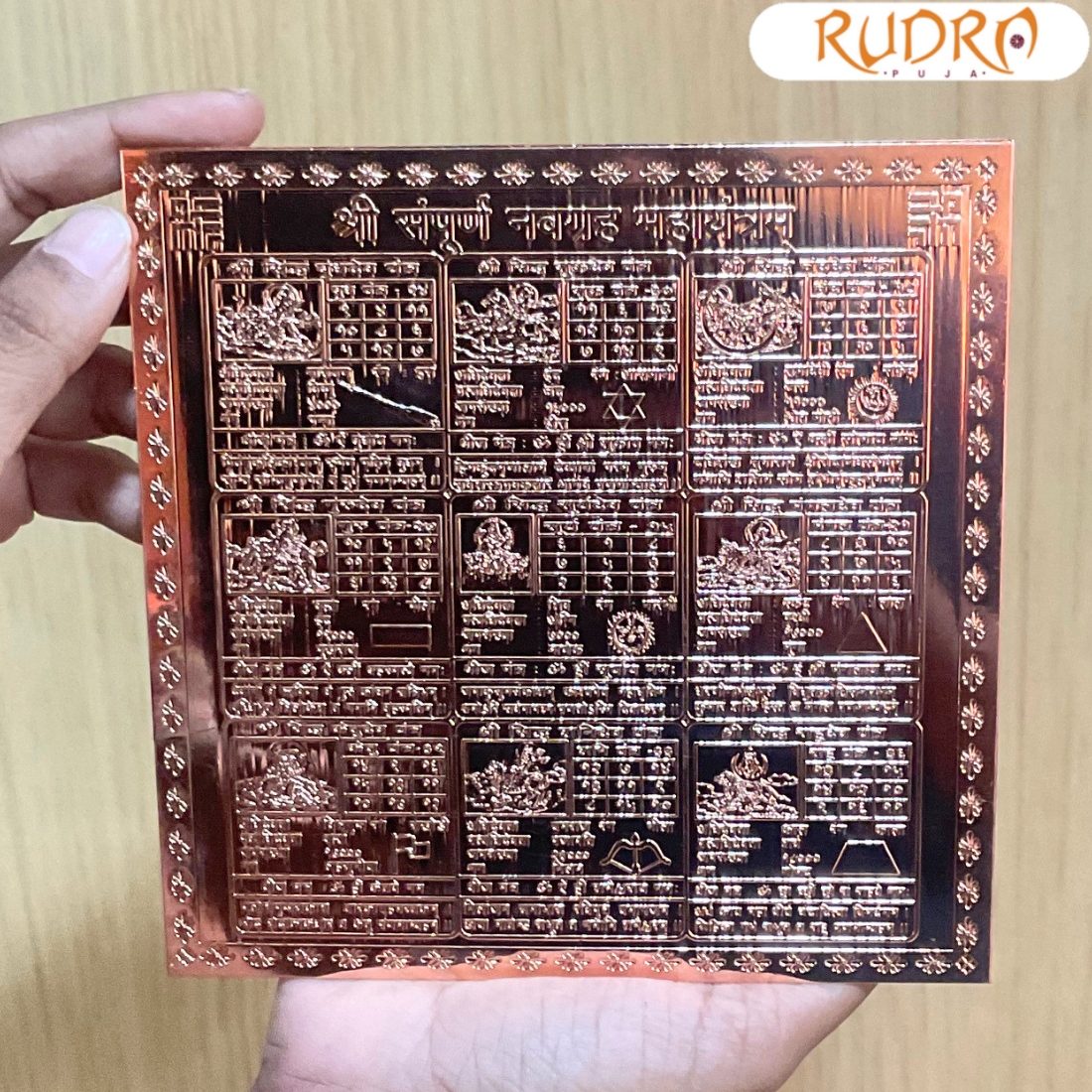 Nine planets influence humankind and their lives. Navagraha Mahayantra is made of pure copper and consists of geometric patterns. It is precisely manufactured in a thick and pure copper sheet with pure gold plating. Magical numbers maths combination and chant mantra. It blesses the devotee with good health, focus. Japa of mantra and Yantra can lead to concentration and peace.