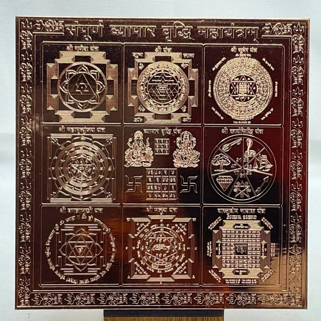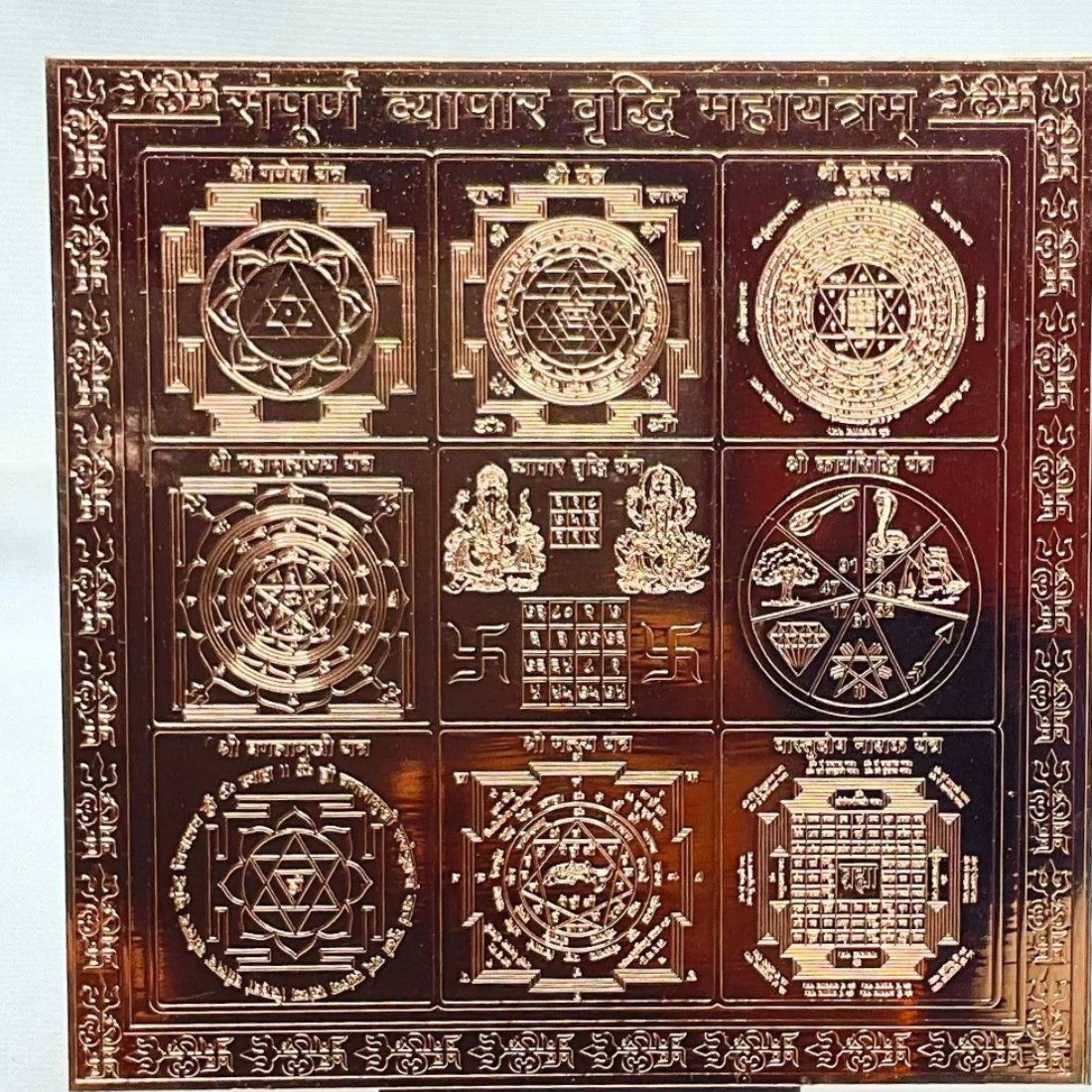 Sampoorna Vyapar Vridhi Yantra 9 inch Copper is a powerful union of the universal Instrument for the growth of business and success in every work. In the middle, Vyapar Vridhi Yantra is considered for the combined worship of Lord Ganesha and Goddess Lakshmi. Ganesha is the God of fortune, new ventures, and good luck and the Laxmi Goddess of prosperity and wealth.