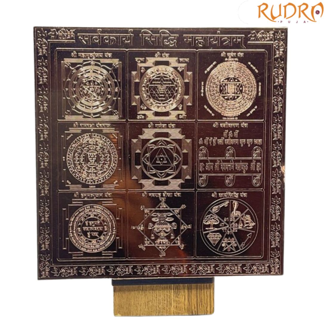 Sarvakarya Siddhi Mahayantram is a great astronomical conveyor of energy, an aerial of Nature, a powerful medium for peace, victory, achievement. The soul and mind focus at the center of the Yantra to reach more essential levels of divinity. Yantra made of pure copper and consists of geometric patterns. It precisely made in a thick and pure copper sheet. Magical numbers maths combination and chant mantra. It blesses the devotee with good health, protection, and the blessings of Deities.