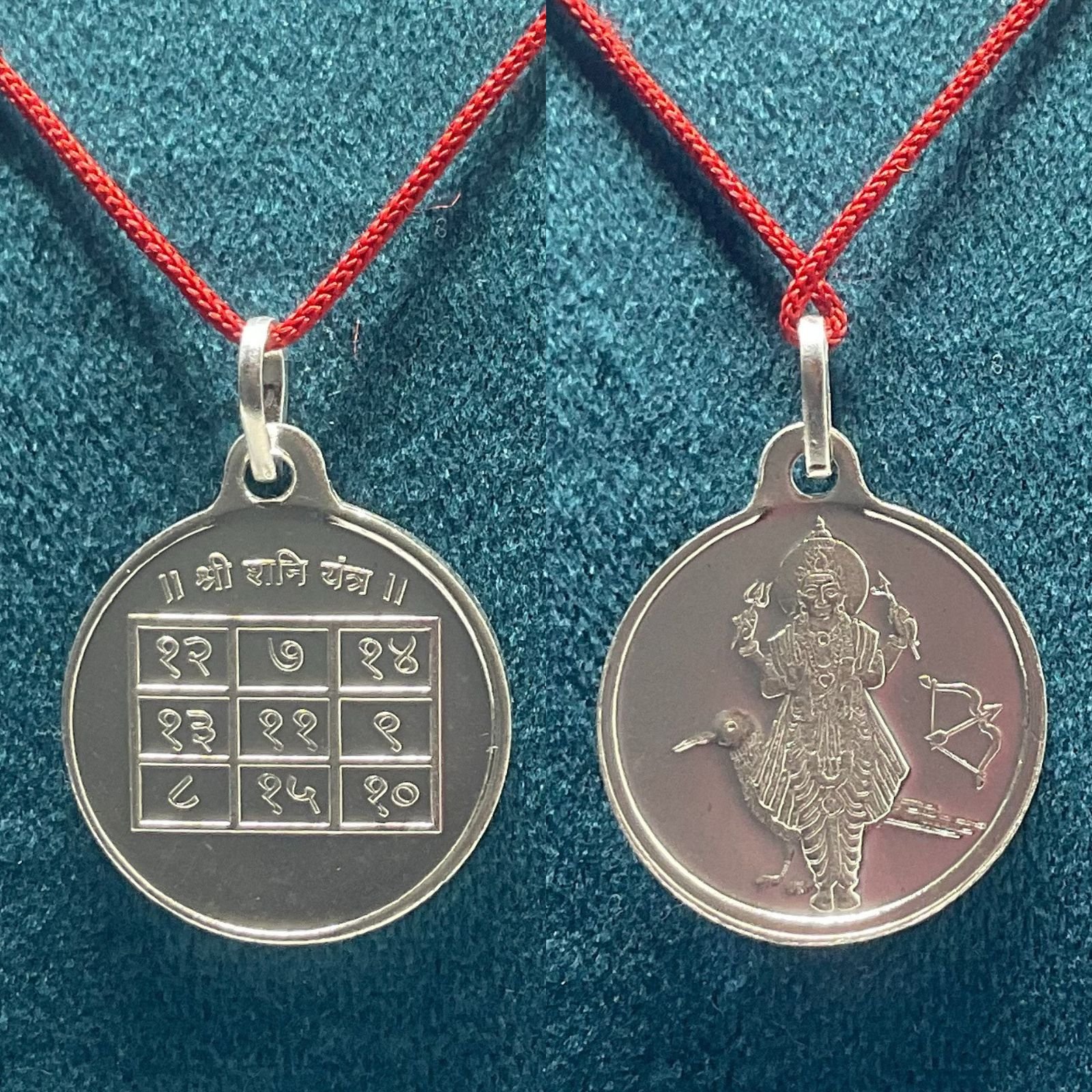 Shani Yantra locket Precisely pure Silver, Designed according to Vedic instructions with the magical total of 33, and the details of his Adhidevta: Yamraj, Pratyadhidevta: Prajapati, Color: Blue or Black, Favorite Gemstone: