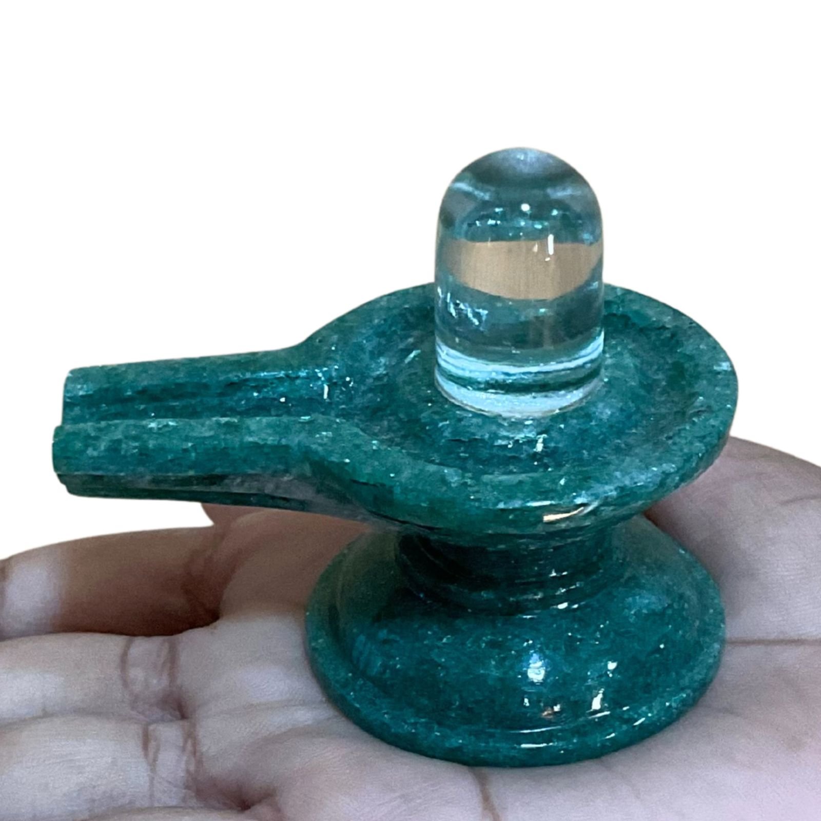 A Sphatik Lingam with a Green Jade Base is a spiritual and decorative item commonly found in Hindu rituals and practices.