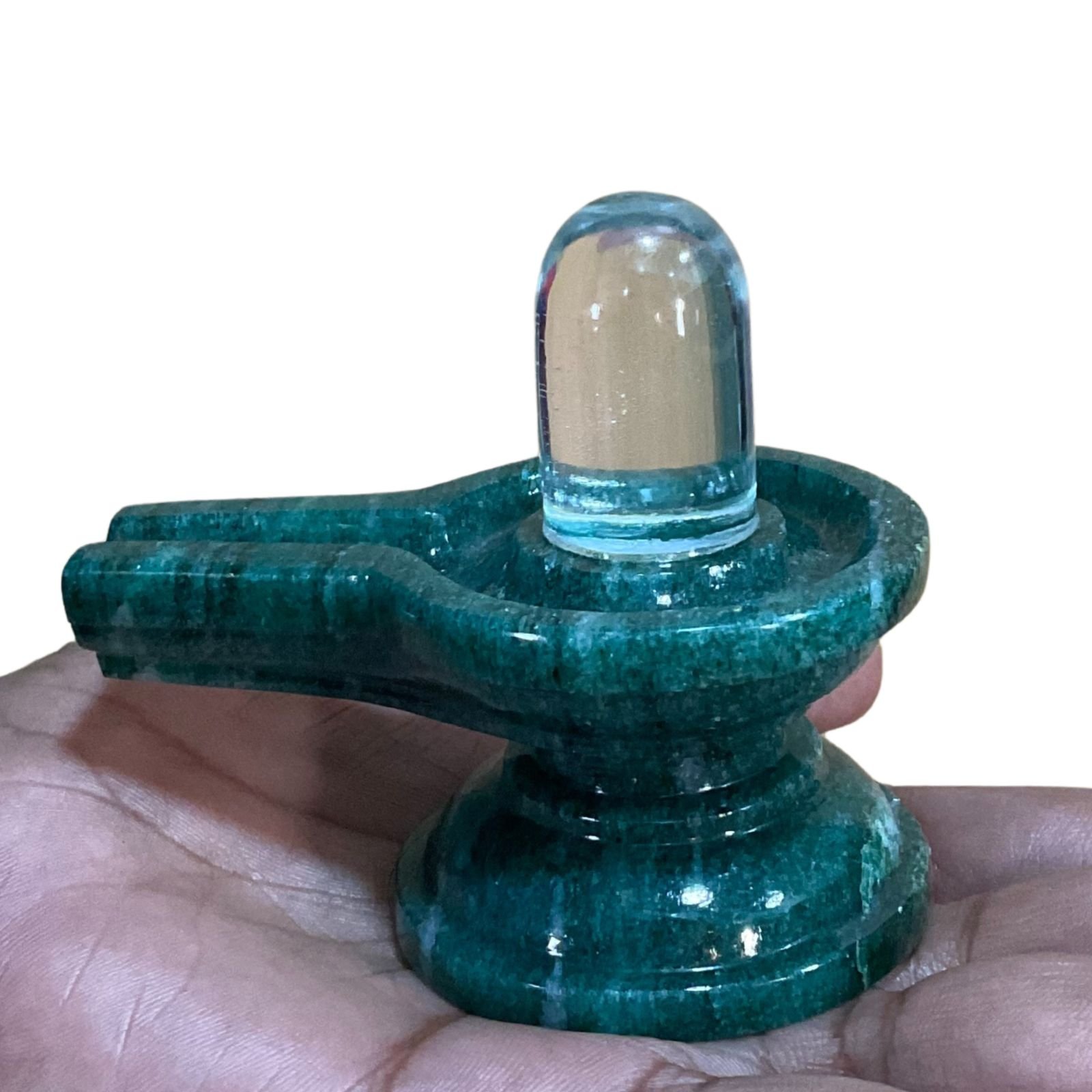 A Sphatik Lingam with a Green Jade Base is a spiritual and decorative item commonly found in Hindu rituals and practices.